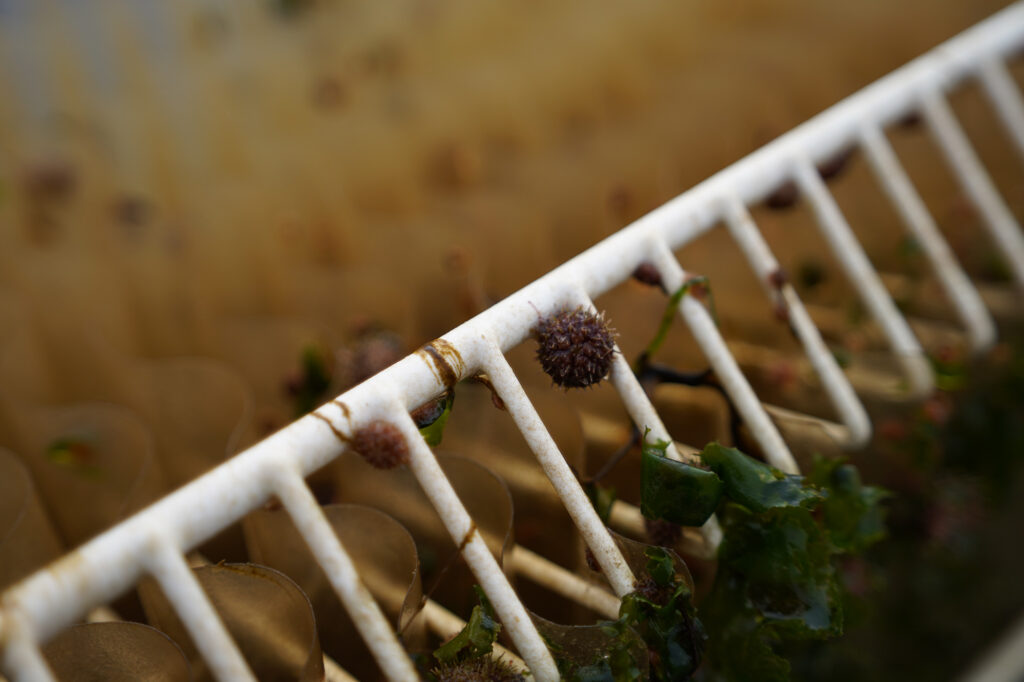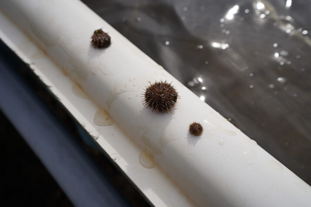 ここでは、人工授精させたウニを陸上の生け簀で約1年かけて育てます。