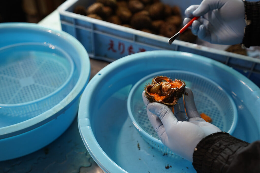 出荷作業にも一切の妥協はありません。ウニを割って身を取り出し、丁寧に「綿(内臓)」を取り除きます。
