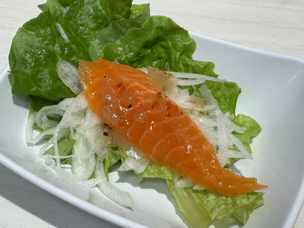 オニオンサーモンにタイ風ソムタムソースがかかり、パクチーが添えられています。