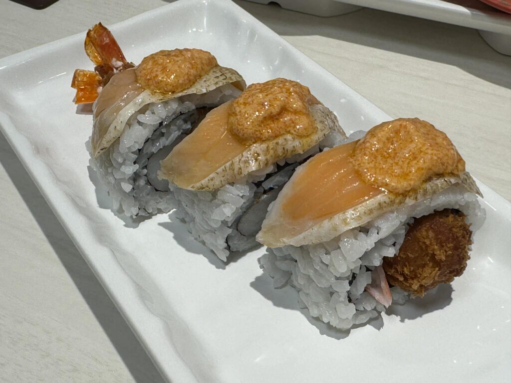 アメリカの「キラウエアフレイムロール」は、エビフライとカニカマのロールに炙ったサーモンをトッピングしたボリューム満点の一品。スパイシーソースが食欲をそそります。