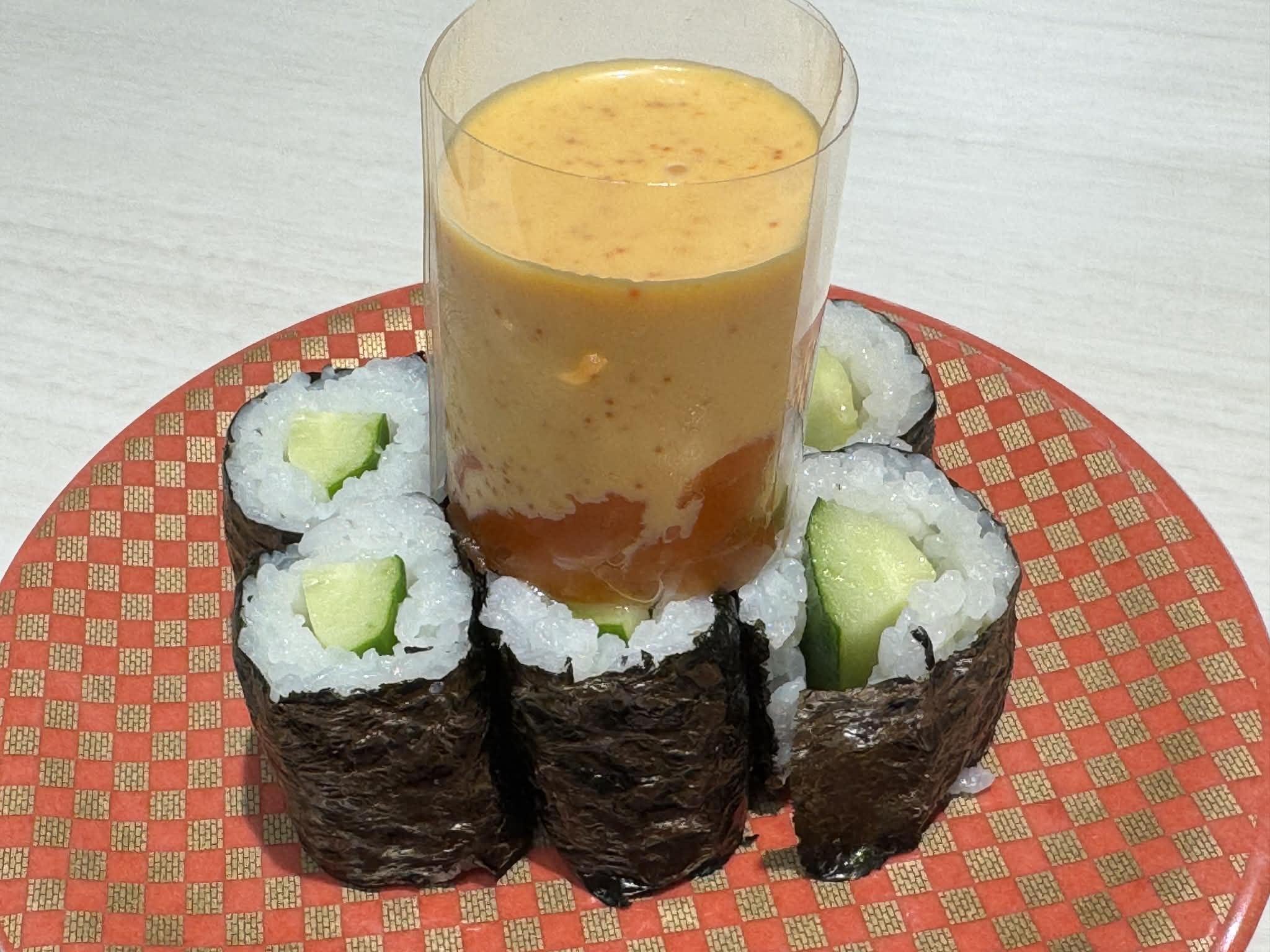 かっぱ巻きの上に角切りのサーモンと、筒状の型にはいったオリジナルの甘酸っぱいにんじんソース。