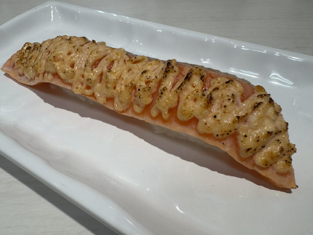 マレーシアの「ジャンボサーモン明太マヨ炙り」は、2貫をまたぐほど巨大なサーモンに、明太マヨ、そして炙り。