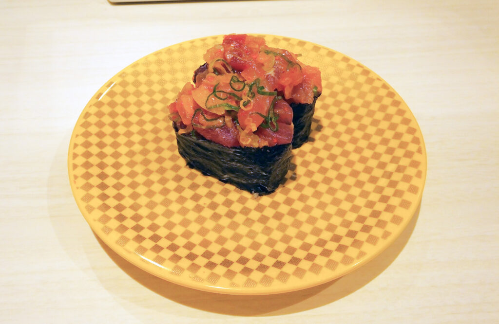 ハワイの海鮮といえばポキというイメージそのままに、ごま油風味でピリ辛のクセになるタレに漬け込んだマグロをたっぷりと乗せた軍艦になっており、米にこだわる魚べいだからこその絶妙なシャリの相性が良く、旨みを感じる絶品でした。
