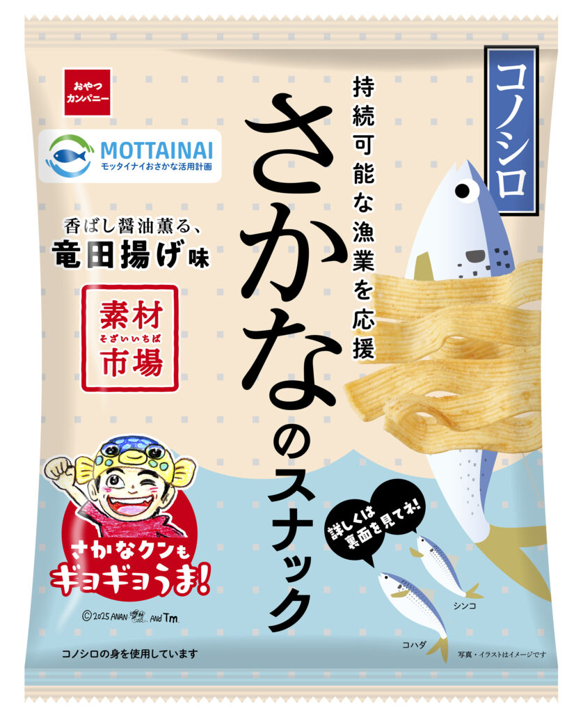 その第一弾商品として、千葉県船橋漁港で水揚げされた低流通魚・コノシロを使ったスナック菓子「素材市場さかなのスナック(コノシロ 香ばし醤油薫る、竜田揚げ味)」を、2025年10月27日(月)より全国で期間限定で発売されました。