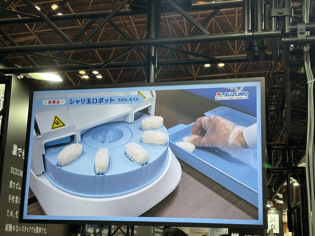 会場には、1時間に最大4,800カンのシャリ玉を成形できるシャリ玉ロボットや、太巻きやカリフォルニアロールなどを自動で仕上げる巻き寿司ロボットが展示されていました。