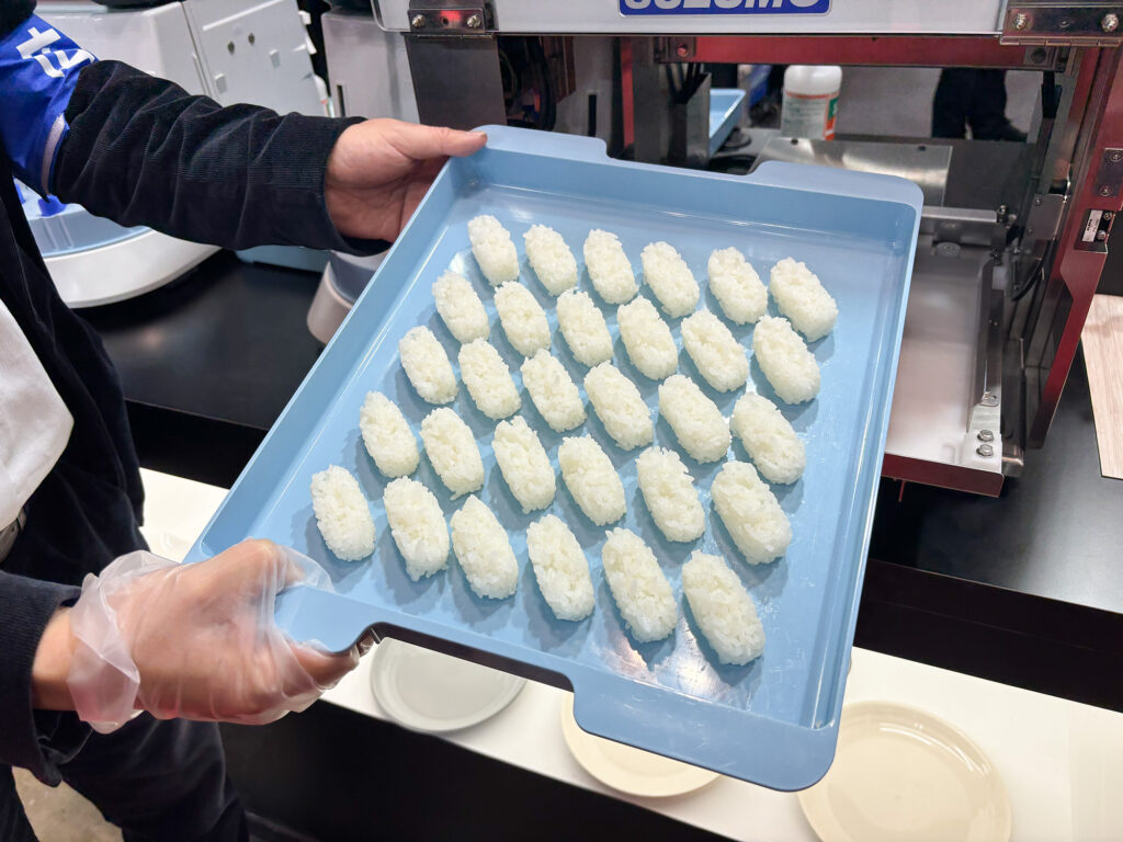 なかでも印象的だったのがシャリ玉ロボットです。機械でありながら、ふわっと空気を含ませた成形を実現。米粒をつぶさず、口の中でやわらかくほどける食感に仕上げていました。
